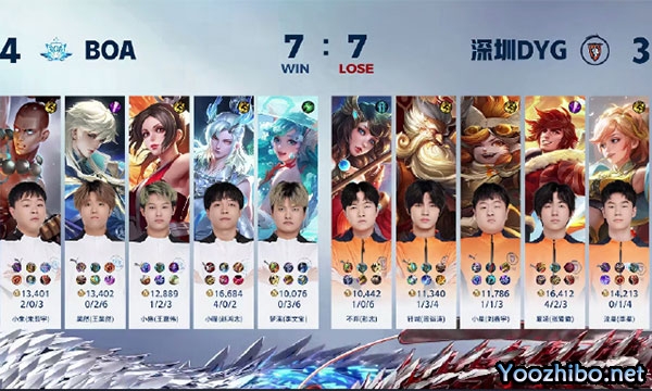 十分十七,BOA控下暗影暴君。十一分二十,深圳DYG三路外塔全部告破。十三分左右,深圳DYG先手开团对方王昭君,小伟 (王嘉伟)王昭君闪开拉开身位,二三技能衔接配合队友击杀对方两人。随后BOA击破对方上路高地后,强势压塔,再次击杀对方两人,BOA击破水晶,拿到本局比赛的胜利,将比分扳平!