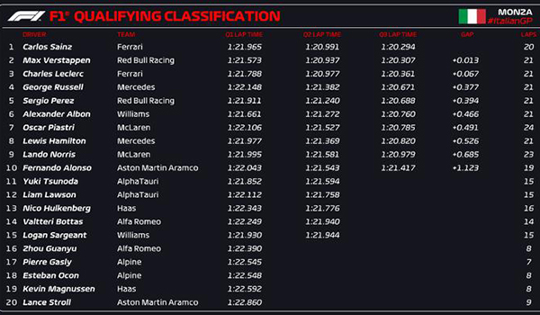 JRS直播网讯 2023年F1意大利大奖赛排位赛,塞恩斯收获赛季首杆,帮助法拉利在蒙扎主场锁定杆位。维斯塔潘第二,勒克莱尔第三!P4-P10依次为,拉塞尔、佩雷兹、阿尔本、皮亚斯特里、汉密尔顿、诺里斯、阿隆索。