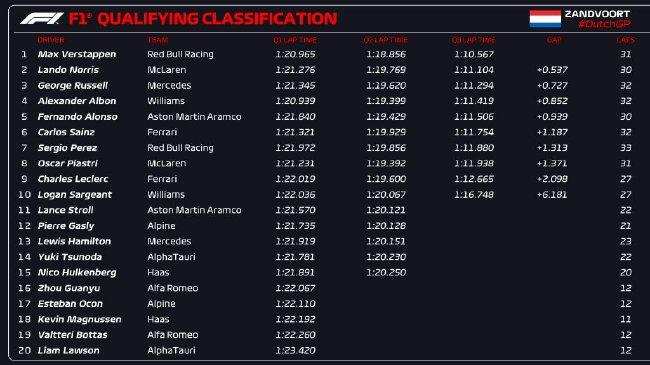JRS直播网讯 2023年F1荷兰大奖赛排位赛结束,红牛车队维斯塔潘以1:10.567取得主场三连杆!迈凯伦车队诺里斯落后0.537秒排名第二,梅赛德斯车队拉塞尔落后0.727秒排名第三,阿尔本和阿隆索分列第四和第五。排名六至十位的车手分别是塞恩斯、佩雷兹、皮亚斯特里、勒克莱尔、萨金特。
