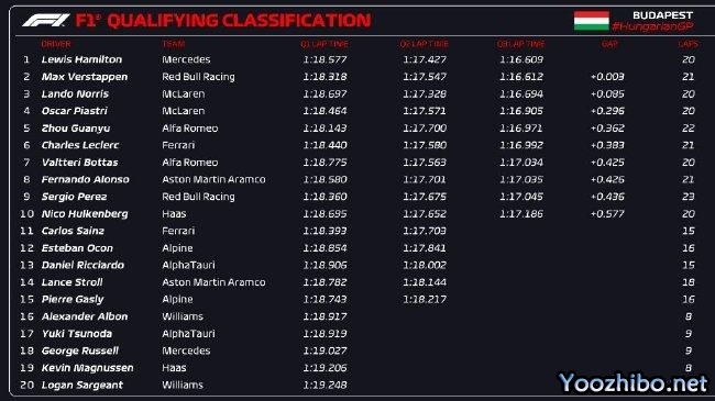 JRS直播网讯 北京时间07月22日,2023年F1匈牙利大奖赛排位赛在布达佩斯赛道结束,梅赛德斯车队汉密尔顿在Q3最后一圈0.003秒的优势绝杀红牛车队维斯塔潘,取得本赛季个人首个杆位!这也是他第104个杆位,再一次刷新F1历史杆位数纪录;维斯塔潘第二,迈凯伦车队诺里斯第三,他的队友皮亚斯特里第四。