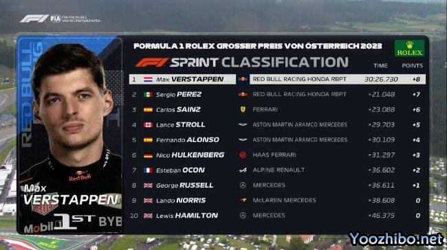 JRS直播网讯 北京时间07月01日,2023F1奥地利大奖赛冲刺赛在红牛环赛道上演,维斯塔潘虽然在发车的阶段被队友佩雷兹超越,但很快完成反超夺回领先,之后一路领跑,以20+秒的优势轻松收获胜利,佩雷兹亚军!法拉利车队塞恩斯第三。