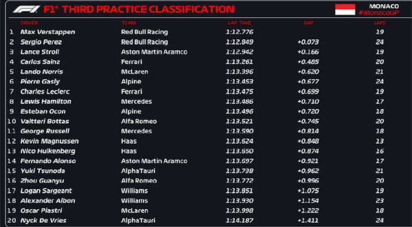 奥康、塞恩斯、汉密尔顿、加斯利、拉塞尔、角田裕毅、诺里斯分列四至十位。中国车手周冠宇名列第19位,期待他周日的正赛能有好的表现。