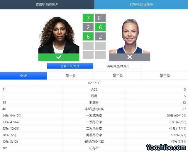 首盘比赛小威在第9局率先破发,5-4来到发球胜盘局。第10局康塔维特顶住压力回破,此后双方各自保发,首盘进入抢七。抢七局小威更胜一筹,7-4赢下了首盘抢七。