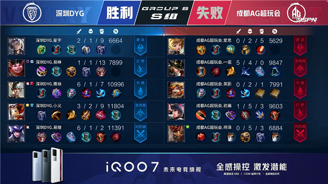 双方常规开局。1分02秒成都AG暴君处击杀张飞拿到一血。1分09秒成都AG拿到中路河道之灵。2分32秒成都AG拿下主宰。2分44秒深圳DYG拿下暴君。4分10秒成都AG击杀姜子牙并摧毁敌方下路外塔。4分51秒成都AG中路击杀姜子牙。5分14秒成都AG摧毁敌方上路二塔。6分28秒深圳DYG下路击杀虞姬。7分24秒成都AG拿下暴君。7分47秒成都AG摧毁敌方中路外塔。8分36秒野区团战深圳DYG打出1换2。9分02秒成都AG拿下主宰。10分02秒成都AG摧毁敌方中路二塔。10分15秒成都AG拿下暗影暴君。10分50秒成都AG拿下暗影主宰。12分正好深圳DYG上路击杀裴擒虎。12分20秒深圳DYG中路打出0换2。14分56秒成都AG拿下暗影暴君。15分46秒上路团战深圳DYG打出1换2。16分18秒双方中路1换1。17分33秒成都AG摧毁敌方下路高地塔。17分42秒成都AG摧毁敌方中路高地塔。18分18秒成都AG摧毁敌方上路高地塔。19分27秒野区团战成都AG打出0换3。19分55秒成都AG摧毁敌方水晶拿下比赛。