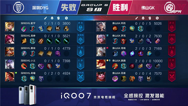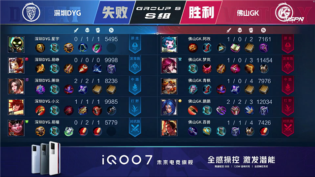 双方平稳开局,2分23秒佛山GK拿下第一条暴君。3分40秒佛山GK姜子牙击杀伽罗拿下一血,4分22秒佛山GK裴擒虎击杀吕布。6月15佛山GK拆掉深圳DYG下路二塔,6分43秒佛山GK拆掉深圳DYG中路一塔。8分40秒深圳DYG中上路二塔被破,9分30秒深圳DYG中路高地被破。10分23秒佛山GK拿下暗影暴君,11分钟佛山GK拆掉深圳DYG下路高地,打出0换3一波摧毁其水晶拿下本局胜利。