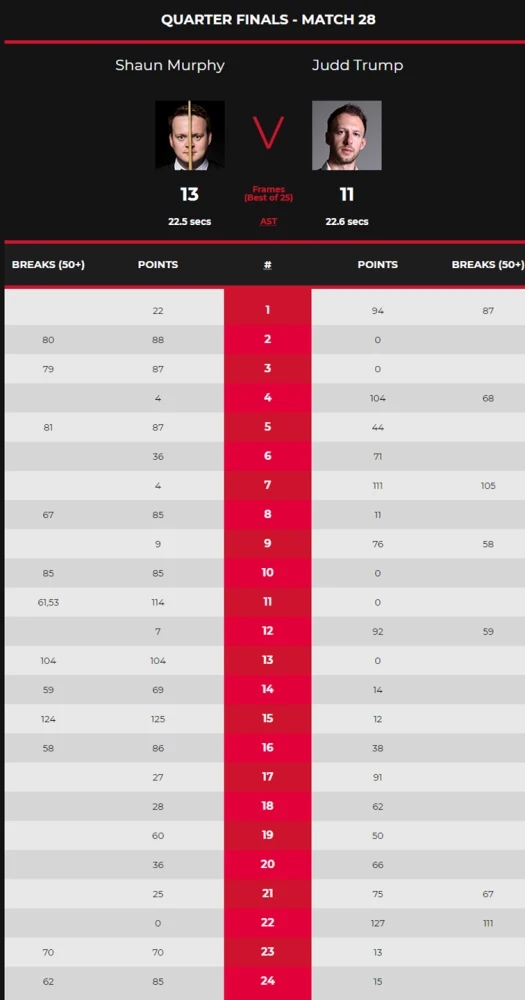 首局,特鲁姆普凭借单杆87分,以94-22先胜一局。第2局,墨菲轰出单杆80分,以88-0扳回一局。第3局,墨菲再次打出单杆79分,以87-0再度零封对手,大比分2-1反超。第4局,特鲁姆普拿下36分后转防守。墨菲出现简单失误送机会,特鲁姆普再度上手,单杆拿下68分,以104-4将大比分扳成2-2,进入局间休息。