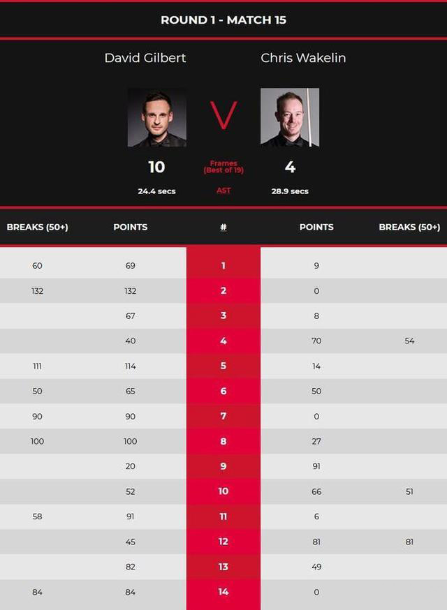 第1局,吉尔伯特单杆60分,以69-9拿下。第2局,吉尔伯特轰出了单杆132分。第3局,吉尔伯特67-8拿下,这也是吉尔伯特赢球局,唯一一位没有单杆50+的。吉尔伯特3-0,第4局,韦克林单杆54分,以70-40拿下。