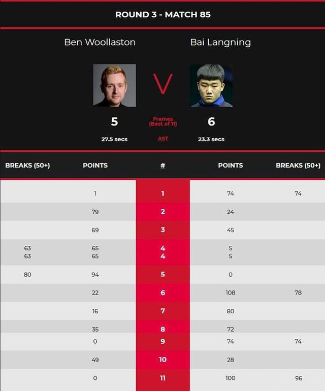 休息回来,第5局,沃拉斯顿再度轰出单杆80分,以94-0零封中国小将再胜一局,大比分4-1领先。不过,这也是沃拉斯顿本场打出的最后一杆50+。此后,白朗宁展开了疯狂反击。第6局,他轰出单杆78分,以108-22追回一局。