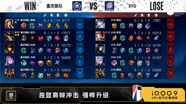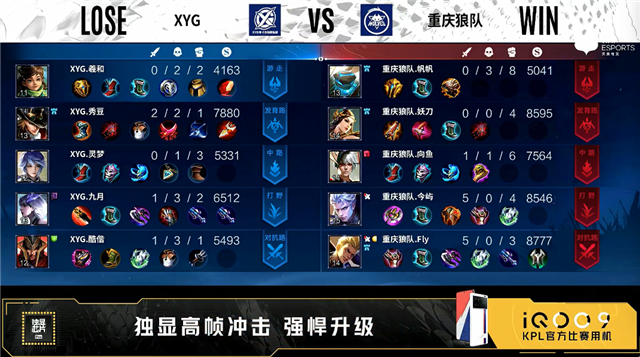 双方常规开局。1分14秒重庆狼队中路击杀太乙真人拿到一血。1分30秒XYG野区打出1换2。3分11秒重庆狼队拿下暴君。3分34秒重庆狼队发育路击杀孙尚香。4分36秒野区团战XYG打出1换2。5分45秒XYG对抗路击杀蒙犽。6分40秒重庆狼队中路击杀孙尚香。10分44秒重庆狼队中路击杀橘右京。11分10秒中路团战XYG打出0换3。11分31秒XYG摧毁敌方中路外塔。12分42秒XYG对抗路击杀吕布。13分03秒XYG摧毁敌方对抗路外塔。14分20秒XYG拿下暗影主宰。15分34秒XYG对抗路击杀澜。15分52秒XYG拿下暗影主宰。16分45秒XYG摧毁敌方中路高地塔,团战重庆狼队打出0换3。18分21秒重庆狼队拿下暗影暴君。19分53秒野区团战重庆狼队打出0换2。22分11秒重庆狼队摧毁敌方中路、发育路高地塔。24分18秒发育路团战重庆狼队打出0换2。24分40秒重庆狼队拿下风暴龙王。25分40秒重庆狼队摧毁敌方对抗路高地塔。26分15秒重庆狼队团灭对手摧毁敌方水晶拿下比赛。