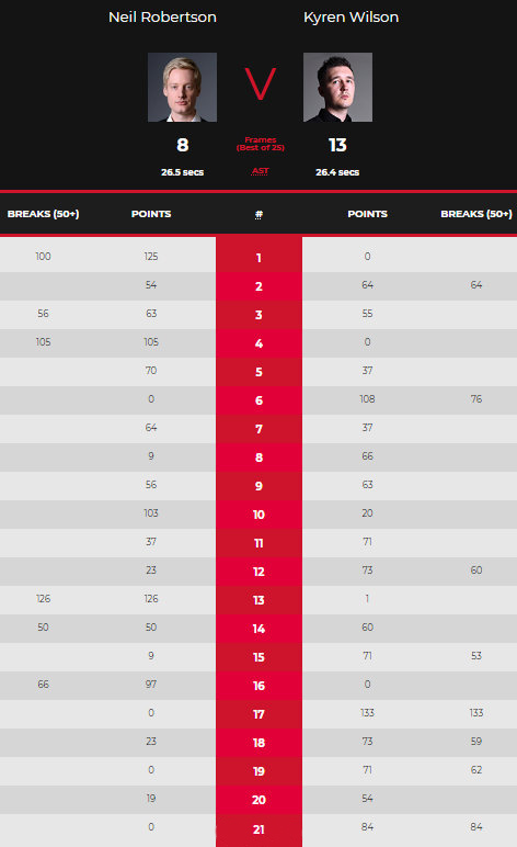 第1局,罗伯逊上手得到25分转入防守,凯伦.威尔逊再次漏球,罗伯逊轰出单杆100分先拔头筹,第2局凯伦.威尔逊0-54落后打出单杆64分完成单局逆转,第3局双方互有失误,罗伯逊打出单杆56分63-55取得领先。第4局凯伦.威尔逊防守漏球,罗伯逊上手轰出单杆105分再赢一局,罗伯逊3-1凯伦.威尔逊。