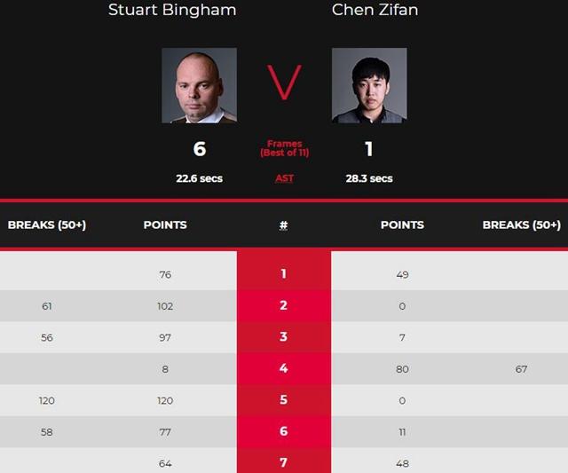 第1局,宾汉姆最后抓住机会单杆20分,以76-49拿下;第2局,宾汉姆单杆61分,以102-0拿下;第3局,宾汉姆单杆56分,以97-7拿下;第4局,陈子凡抓住机会单杆67分超分,以80-8追回一局。