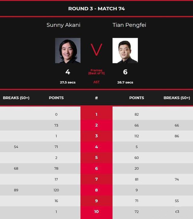 休息回来,第5局,田鹏飞再次以60-2将大比分第三次超出;而宋沙瓦则在第6局轰出单杆68分,以78-20再次将大比分扳为3-3。第7局,田鹏飞轰出单杆74分,以81-17胜出,大比分第四次领先。但第8局,宋沙瓦还了一个单杆89分,以120-9再次扳平。