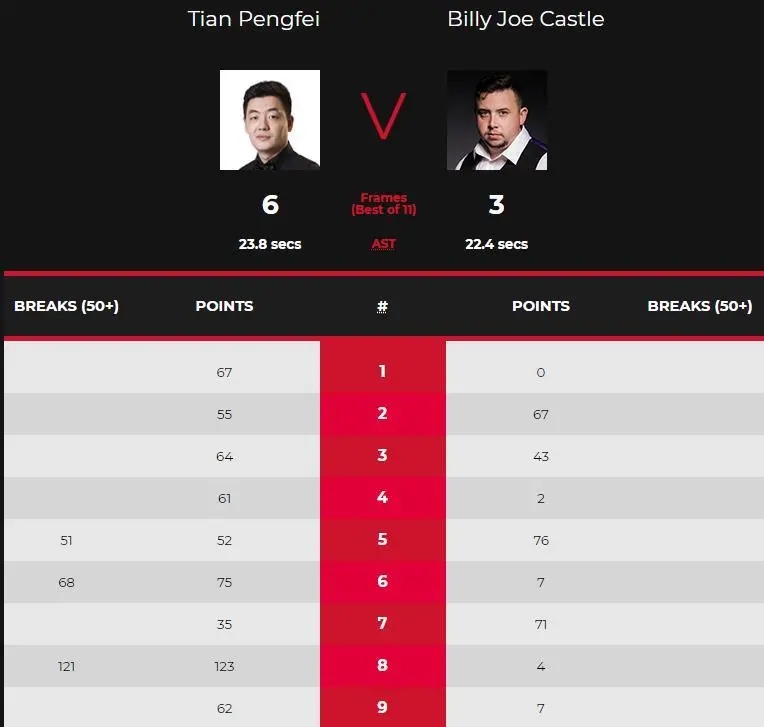 第6局,田鹏飞持续展现单杆表现,他又打出单杆68分,75-7再胜一局,4-2领先。第7局,卡斯尔止住颓势,他通过几次上手,以71-35扳回一局,比分追成4-3。