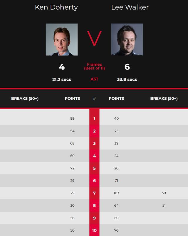 第9局,李沃克36-6又中断,达赫迪36-36,李沃克清台拿下,5-4反超拿到赛点。但因为耗时较长,比赛被裁判叫停了!经过长时间的休整之后,第10局,李沃克一鼓作气,70-50险胜,6-4晋级。