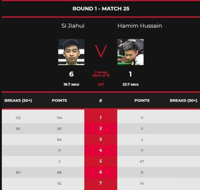 第1局,斯佳辉便打出了单杆122分,134-0完成了零封,顺利拿下。第2局,胡赛因更是仅仅拿到5分,斯佳辉迅速上手,单杆85分完成一杆制胜,85-5再下一城,早早取得了2-0的领先。第3局和第4局,斯佳辉虽然未能打出单杆50+,但还是84-2、71-11连赢两局,又没有遇到太大的阻碍,成功取得了4-0的巨大优势。