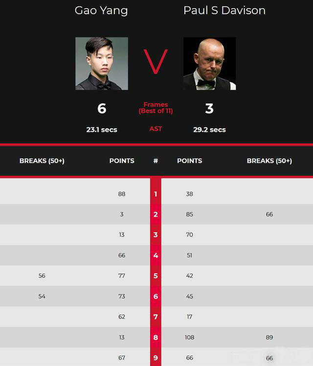 第1局,高阳率先进入状态,88-38轻松拿下,取得了开门红。第2局,戴维森单杆66分、85-3大胜还以颜色,1-1打平。第3局,戴维森延续手感,70-13再下一城,2-1完成反超。第4局,高阳及时止住颓势,66-51险胜,2-2扳平。