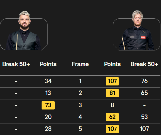 奥利弗-莱恩斯背水一战,在这一局中打得更加积极主动,他的进攻成功率有所提高,给罗伯逊带来了一定的压力。但罗伯逊依然保持着较高的竞技水平,在一番胶着的较量后,惊险地拿下了这一局,以 3-1 的比分拿到赛点。