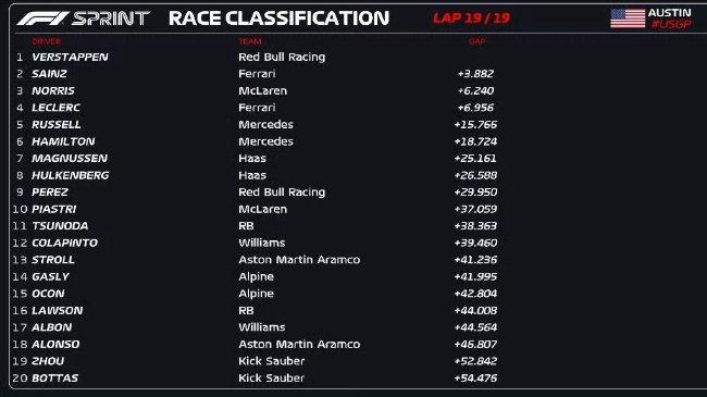 JRS直播网讯 2024年F1美国大奖赛冲刺赛在奥斯汀赛道结束,红牛车队维斯塔潘收获赛季冲刺赛第4胜,继续扩大积分榜的领先优势。法拉利车队塞恩斯最后一圈超越迈凯伦车队诺里斯获得亚军。诺里斯和另一位法拉利车手勒克莱尔分列第三和第四。
