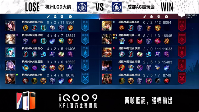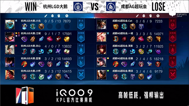 2分56秒,杭州LGD大鹅中路击杀澜拿下一血。3分55秒,成都AG拿下先知主宰。4分38秒,杭州LGD大鹅拿下暴君。5分47秒,杭州LGD大鹅破掉成都AG下一塔。6分钟,成都AG中路击杀夏侯惇,随后杭州LGD大鹅破掉成都AG下二塔。6分40秒,成都AG破掉杭州LGD大鹅上一塔。7分42秒,野区团,杭州LGD大鹅打出1换2。8分38秒,暴君团,双方1换1。9分钟,杭州LGD大鹅中路击杀蒙恬,随后杭州LGD大鹅拿下暴君。9分37秒,成都AG拿下主宰。9分56秒,野区团,杭州LGD大鹅打出0换2。10分36秒,杭州LGD大鹅拿下暗影主宰,随后成都AG拿下暗影暴君。11分35秒,成都AG破掉杭州LGD大鹅中一塔。11分50秒,野区团,双方打出2换2。12分42秒,中路团,成都AG打出0换2,随后破掉杭州LGD大鹅中二塔。14分23秒,杭州LGD大鹅拿下暗影主宰。14分42秒,成都AG拿下暗影暴君,随后团战成都AG打出2换5。15分36秒,成都AG破掉杭州LGD大鹅中路高地塔。16分40秒,成都AG破掉杭州LGD大鹅下二塔。18分11秒,成都AG拿下暗影主宰。18分50秒,成都AG拿下暗影暴君。19分22秒,下路团,成都AG击杀露娜。19分53秒,成都AG摧毁水晶扳回一局。