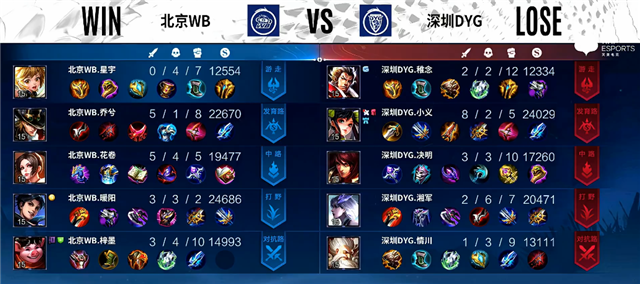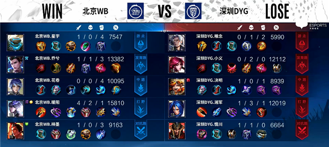 开局澜反下红Buff。3分钟露娜拿下暴君。4分钟野区团战,吕布拿下一血。4分20秒鲁班七号推掉下路一塔。4分30秒澜拿下主宰。6分钟上路团战,鲁班七号被击杀。7分钟上路团战,双方1换1。7分50秒露娜拿下暴君,鲁班七号被击杀。9分钟百里守约推掉中路一塔。10分50秒澜拿下主宰,露娜拿下暴君。13分30秒河道团战,北京WB打出1换2。14分50秒野区团战,北京WB打出1换2,露娜拿下主宰。16分30秒露娜拿下暴君。17分10秒百里守约推掉中路高地塔。17分40秒鲁班七号被击杀。18分钟中路团战,深圳DYG打出0换2,狄仁杰推掉中路一塔,澜拿下主宰。20分钟风暴龙王团,深圳DYG打出1换2。22分钟澜拿下风暴龙王。24分23秒深圳DYG推掉水晶率先拿下一分。