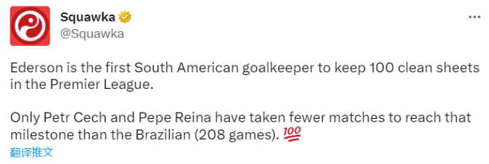 24直播网讯03月05日赛后,据Squawka报道,埃德森本场完成了他个人在英超联赛的第100场零封,他也成为了首位在英超零封100场的南美门将。
