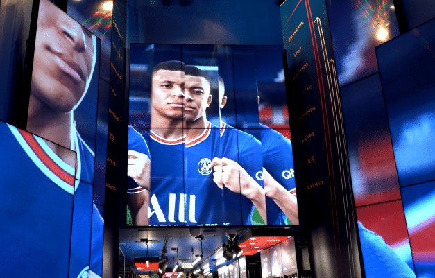除了巴黎王子公园球场之外,大巴黎近期在著名的香榭丽舍大街开设的一家新旗舰店,进入到里面之后给人的感觉是非常亮、非常炫,因为他们使用的也是海信提供的一系列LED显示屏、视频墙和数字标牌等产品,可以说现场氛围和体验,堪称满分。