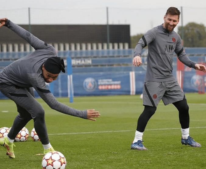 梅西也在赛前发布了两张自己和队友一起训练的照片,与姆巴佩踢球、与内马尔一起在健身房锻炼。