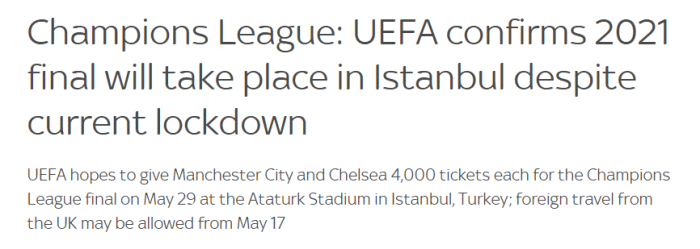 欧足联希望至少分给曼城切尔西每家各4000张球票。欧足联本来想允许球场容量(75000人)一半的观众入场,但疫情期间观众人数可能会减少。