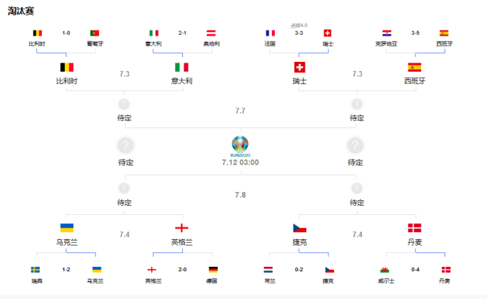 24直播网讯 北京时间6月30日清晨,随着乌克兰2-1淘汰瑞典,欧洲杯1/8决赛全部结束,八场比赛详细比分为:意大利2-1奥地利、比利时1-0葡萄牙、西班牙5-3克罗地亚、瑞士3-3(点球5-4)法国、丹麦4-0威尔士、捷克2-0荷兰、英格兰2-0德国、乌克兰2-1瑞典。