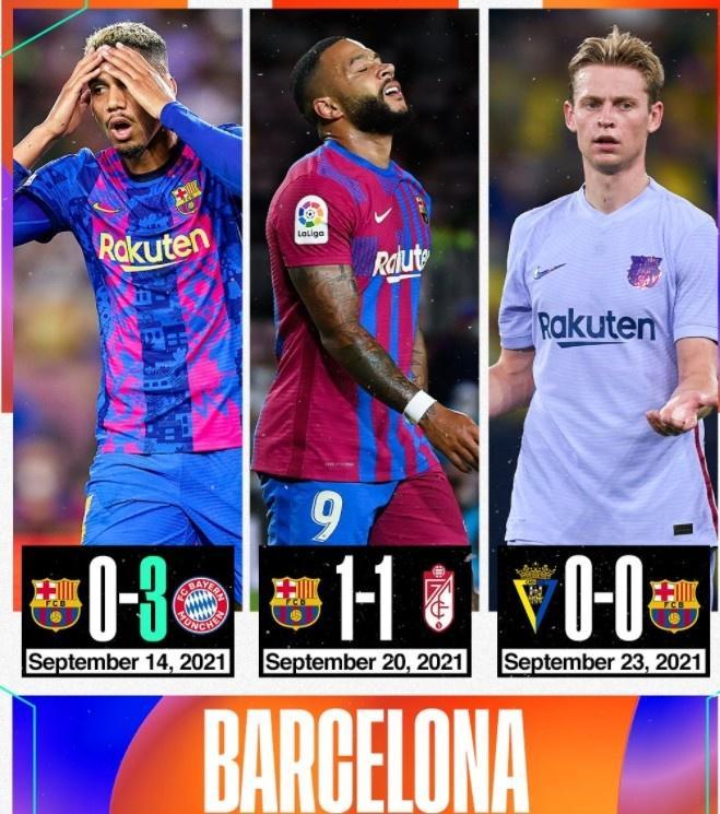 他们先是在欧冠主场0-3惨败拜仁,接着在联赛主场1-1平格拉纳达,今天又在客场联赛0-0被加的斯逼平。