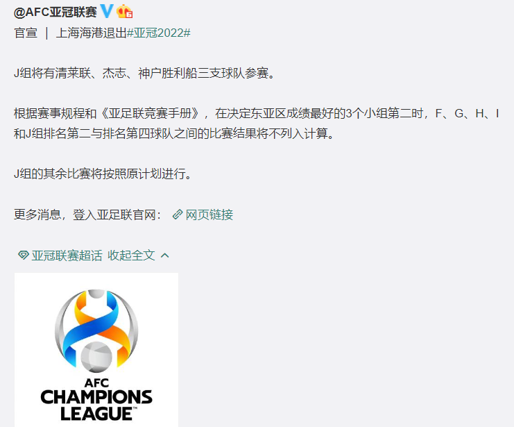 按照要求,泰山队、海港和广州都提交了亚冠参赛名单,三队都是以年轻球员为主。就在开赛前不到一周的时间,海港退出亚冠联赛,这也与现阶段上海的情况有关,球队无法正常训练参赛。亚冠联赛官方宣布海港退出,他们所在的小组只剩下三支参赛队。与此同时,F、G、H、I和J组排名第二与排名第四球队之间的比赛结果将不列入计算。按照规则,东亚区分为5个小组,小组第一和成绩较好的3个小组第二进入8强。