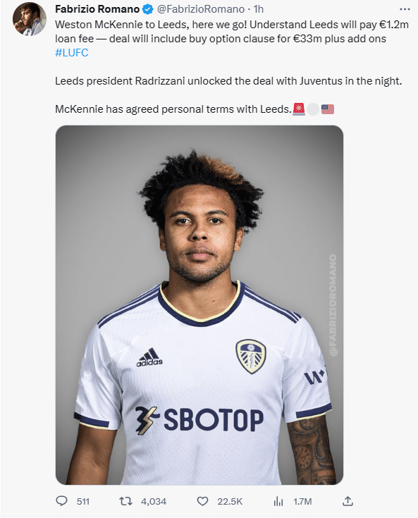 利兹联主席拉德里扎尼在晚上与尤文图斯达成交易,麦肯尼也已与利兹联就个人条款达成一致。