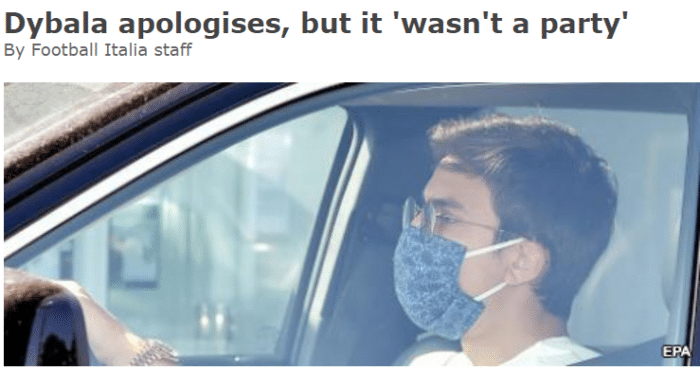 事件发生后,迪巴拉在Instagram上发文道歉,他表示他们并没有开派对,只是一起聚餐吃饭,但承认无论如何,在目前的防疫局势下,聚餐仍是错误的做法,并作出了道歉。