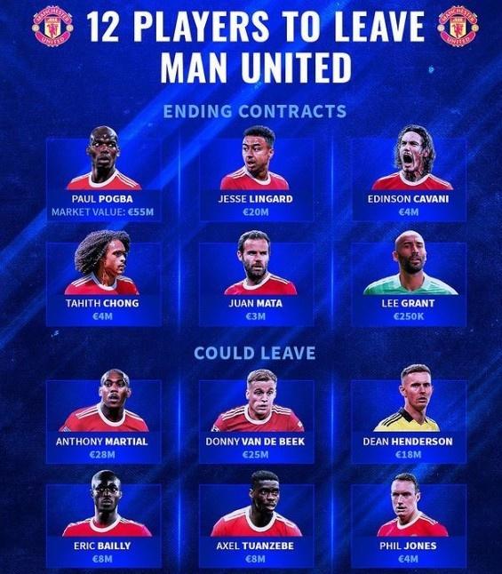 六名合同到期的球员分别是博格巴、林加德、卡瓦尼、钟塔西、马塔和格兰特,而六名可能离队的球员则是马夏尔、范德贝克、迪恩-亨德森、拜利、图安泽贝和琼斯。