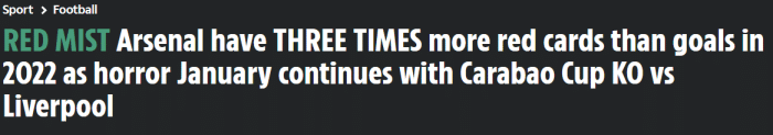 24直播网01月22日讯 英国媒体《太阳报》报道,进入2022年之后,阿森纳遭遇了一件非常尴尬的事,他们的红牌数比进球数还多。