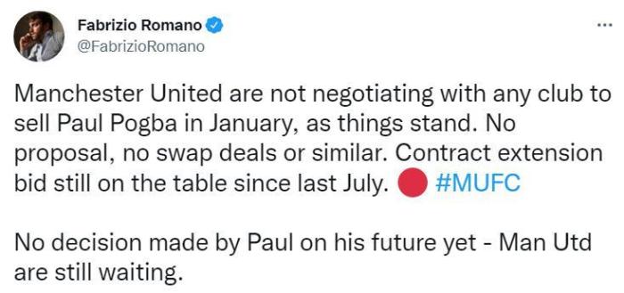 罗马诺表示,按目前情况来看,曼联没有与任何球队接触或探讨关于博格巴1月转会的相关事宜。没有报价,也没有球员交换或其他提议,自去年7月以来,博格巴的续约仍在谈判中。