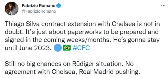 罗马诺表示,巴西老将蒂亚戈-席尔瓦与切尔西的续约是毫无疑问的,剩下只是需要准备好纸质合同,他会在未来几周或几个月内和切尔西续约至2023年6月。