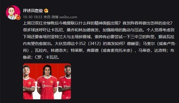 24直播网10月31日讯 本轮英超,曼联将迎战热刺,赛前詹俊发文进行了前瞻。