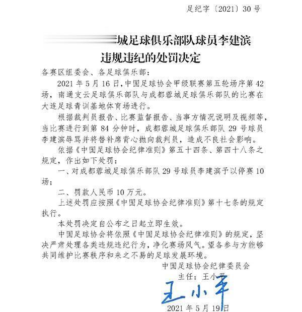 一、对成都蓉城足球俱乐部队29号球员李建滨予以停赛10场;