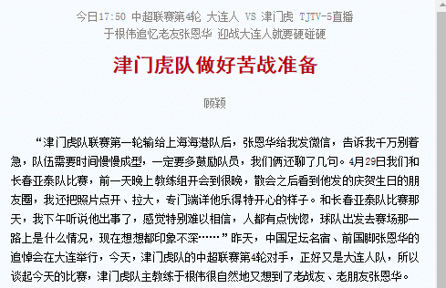 24直播网讯 北京时间5月11日,据《天津日报》报道,昨天在张恩华的追悼会上,津门虎主教练于根伟透露中超首轮比赛结束后,张恩华还给他发去了微信。