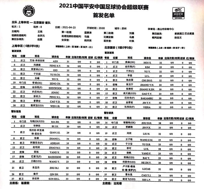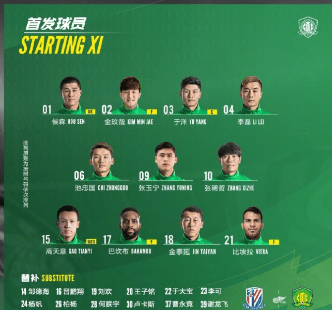 24直播网讯 北京时间4月23日,中超联赛第一轮,北京国安对阵上海申花,赛前,这场比赛的首发名单出炉。